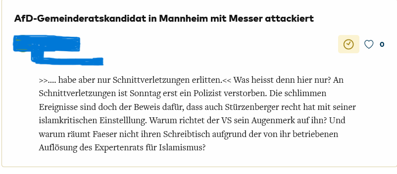 maxikatze hat geschrieben:AfD-Gemeinderatskandidat in Mannheim mit Messer attackiert