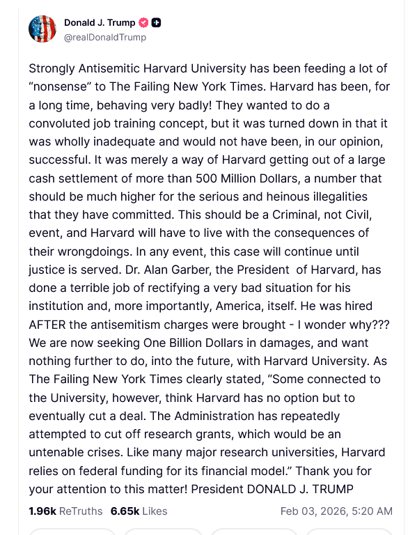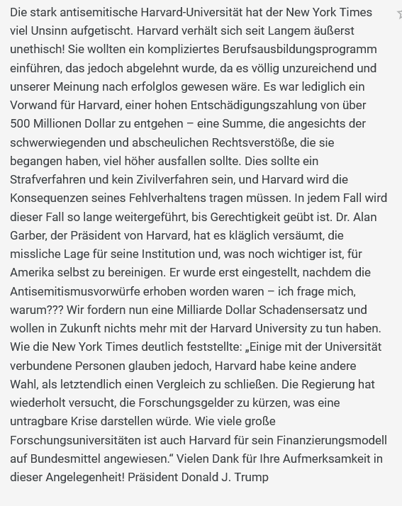 Dass er das Harvard - Fass wieder aufmacht, sieht stark nach einem Ablenkungsmanöver aus. Nach vielen Fehlschlägen und dem ICE - Skandal in Minneapolis wendet sich die Stimmung in den USA langsam gegen die Republikaner und im November sind Zwischenwahlen, die Trump zur "lahmen Ente" machen könnten.