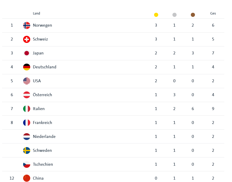 Bisheriger Medaillenspiegel: