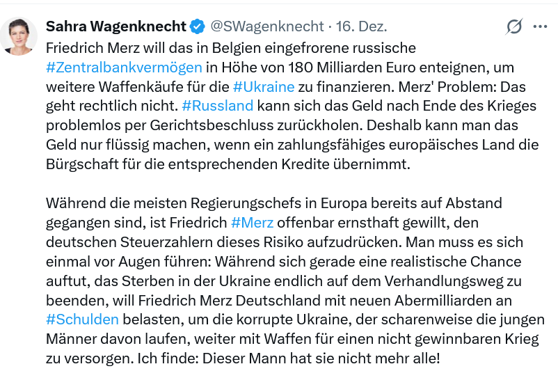 Längst frage ich mich, ob nicht alle einen kompletten Dachschaden haben, die heute schon wieder, die EU ganz vorne weg, die Kriegstrommel rühren. Die Kriegstreiber unter den Spitzenpolitikern haben wohl 80 Jahre Frieden nicht ausgehalten.