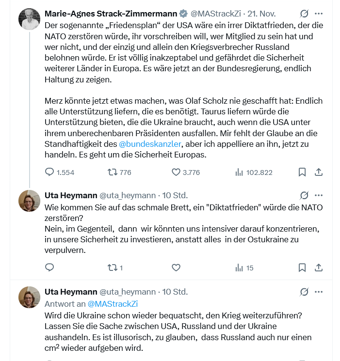 EU-Politiker, allen voran v.d.Leyen, Strack-Zimmermann sowie Bundetagsabgeordneter Hofreiter sind, wie zu erwarten, von vornherein gegen den Friedensplan.
